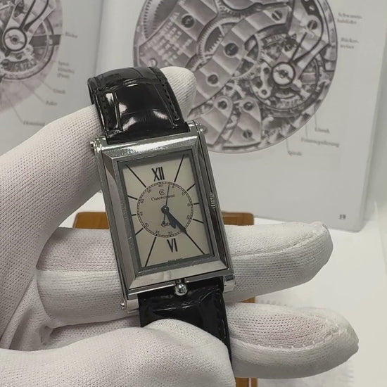 - Special features: Signed by Gerd-Rüdiger Lang (engraved into the case, making it even more unique), Reversible case, Limited production, Hand-wound movement, Rectangular design in Art Deco style, Silver dial with Roman numerals and small second hand, Hand-stitched leather strap